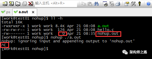 最后测试一下nohup和&同时使用,即用nohup./a.out &运行程序,又会是什么效果呢?