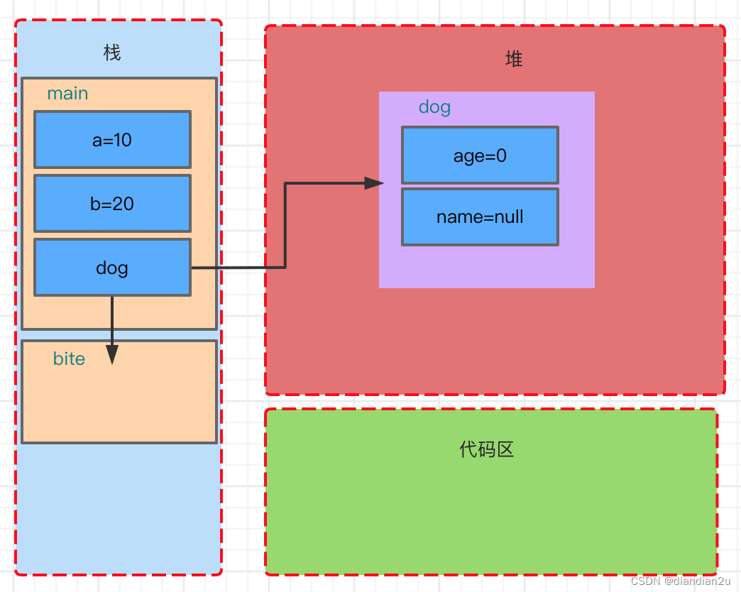 在栈中找age=20,如果栈中没有,则去dog指向的堆中找age的值,进行输出操作。执行完dog.info()后,该空间会被释放,调用dog.bite(),又在栈中分配空间: