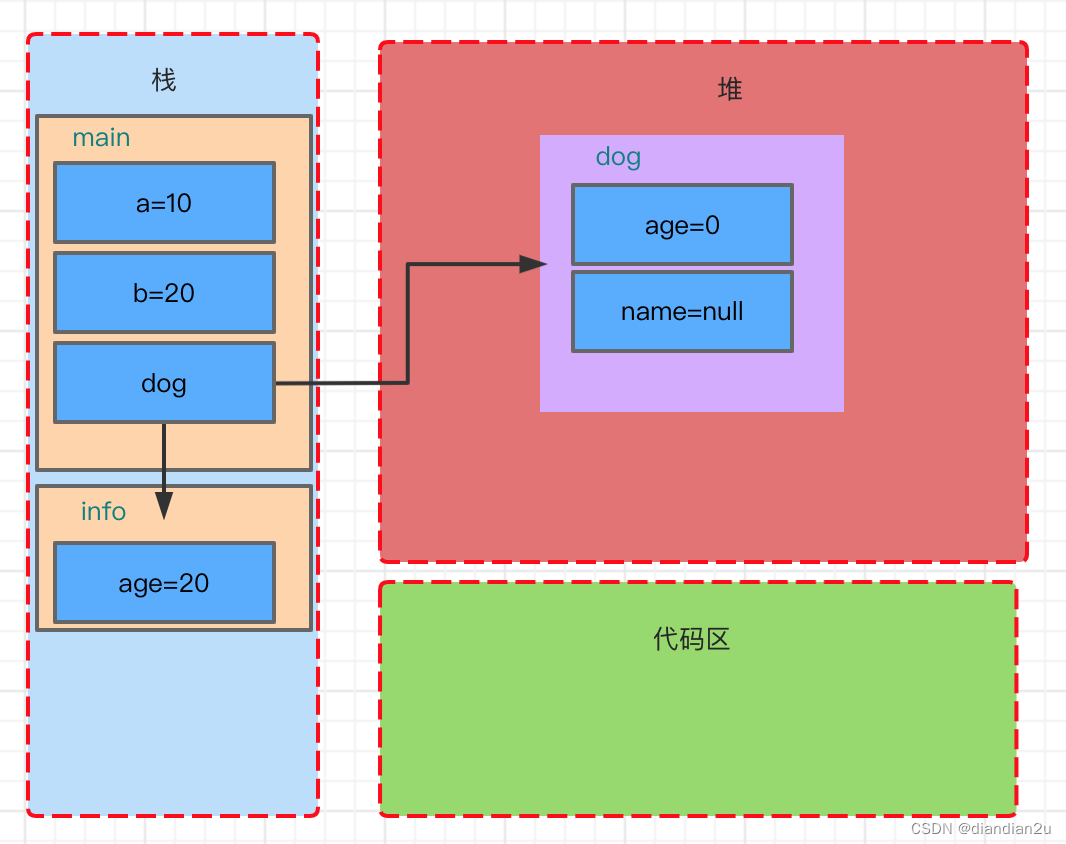 代码的源程序存储在方法区中,当java 运行后,在方法区中找main函数,在执行dog.info()时,分配空间如图所示: