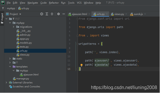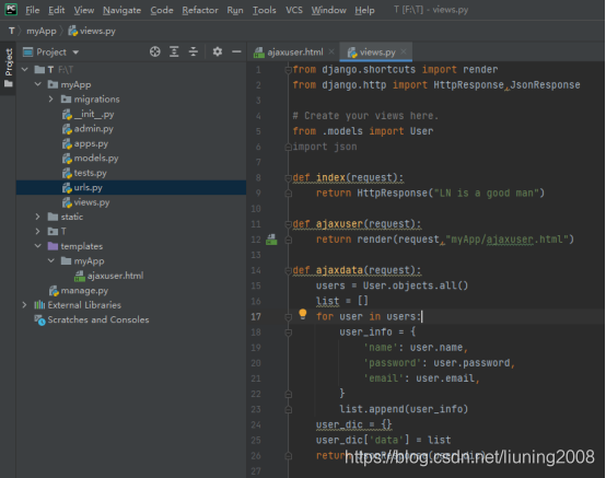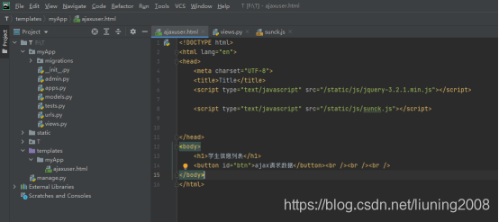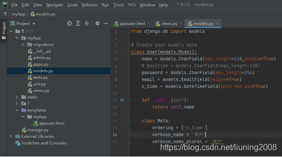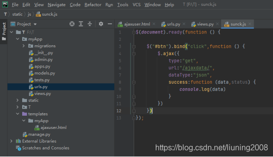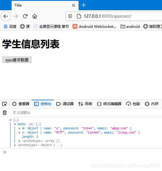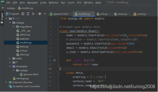 本文档展示了如何在Django中通过Ajax获取并显示User模型的数据。首先在models.py创建User模型,接着创建ajaxuser.html页面和对应的JavaScript文件sunck.js,设置Ajax请求获取JSON数据。然后在urls.py配置URL,views.py中定义视图函数返回用户数据。最后启动服务器并测试,当点击按钮时,数据将动态加载到页面。
