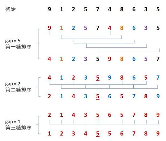 先取一个小于n的步长d1,把表中所有距离为d1的倍数的记录放在同一个组中,在各组中进行直接插入排序;然后取第二个步长d2≤d1,重复上述过程,直到所取到的dt=1,即所有记录已放在同一组中,再进行直接插入排序,由于此时已经具有较好的局部有序性,故可以很快的得到结果。到目前为止,尚未求得一个最好的增量序列,希尔提出的方法是d1 = n/2,di+1=di/2,并且最后一个增量等于1。