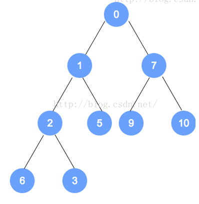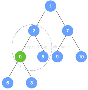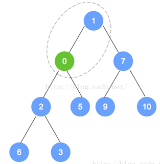 数字0的节点首先加入到该二叉树最后的一个节点,依据最小堆的定义,自底向上,递归调整。