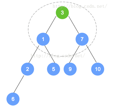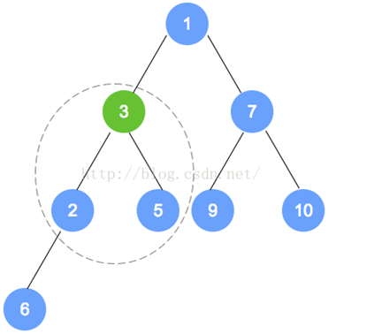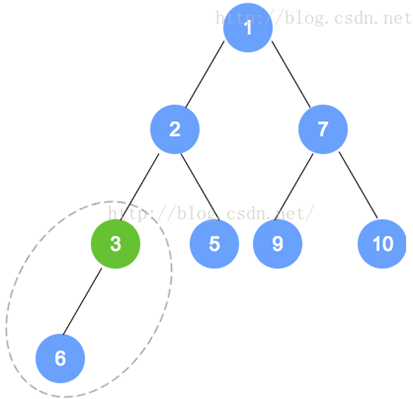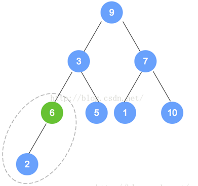 填入后,找到最后一个结点(本示例为数字2的节点),从它的父节点(本示例为数字6的节点)