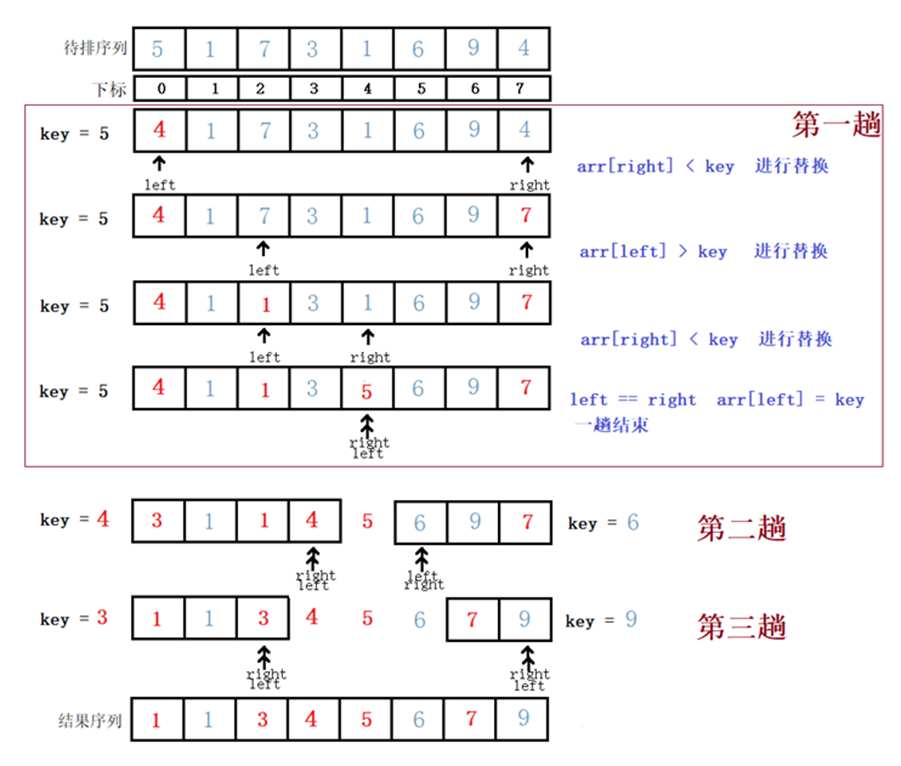 快速排序是对冒泡排序的一种改进,其基本思想是基于分治法的:在待排序表L[1…n]中任取一个元素pivot作为基准,通过一趟排序将待排序表划分为独立的两部分L[1 … k−1]和L[k+1 … n]使得L[1 … k−1]中所有元素小于pivot,L[k+1 … n]中所有元素均大于或等于pivot,则pivot放在了其最终位置L(k)上,这个过程称为一趟快速排序。
