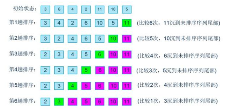 下一趟冒泡的时候,前一趟确定的最小元素不再参加比较,待排序列减少一个元素,每趟冒泡的结果把序列中的最小元素放到了序列的最终位置。