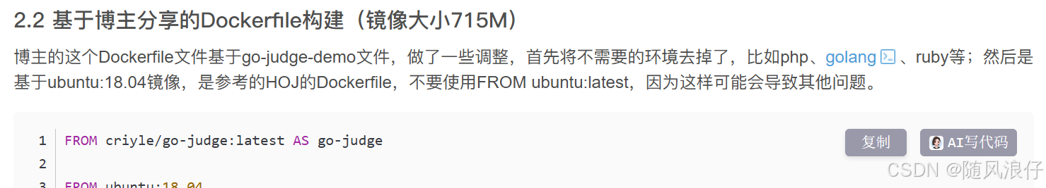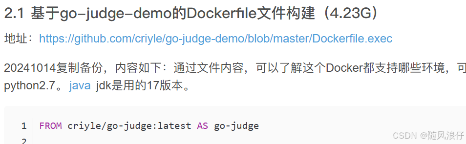 go-judge官网提供的docker部署方式,是基于criyle/go-judge镜像,这个镜像是最小化的linux环境,不支持python、java、c++;如果希望有一个多语言的判题环境,则需要自己构建镜像部署。本文则介绍构建镜像的步骤,以及可参考的镜像文件(Dockerfile)有哪些。