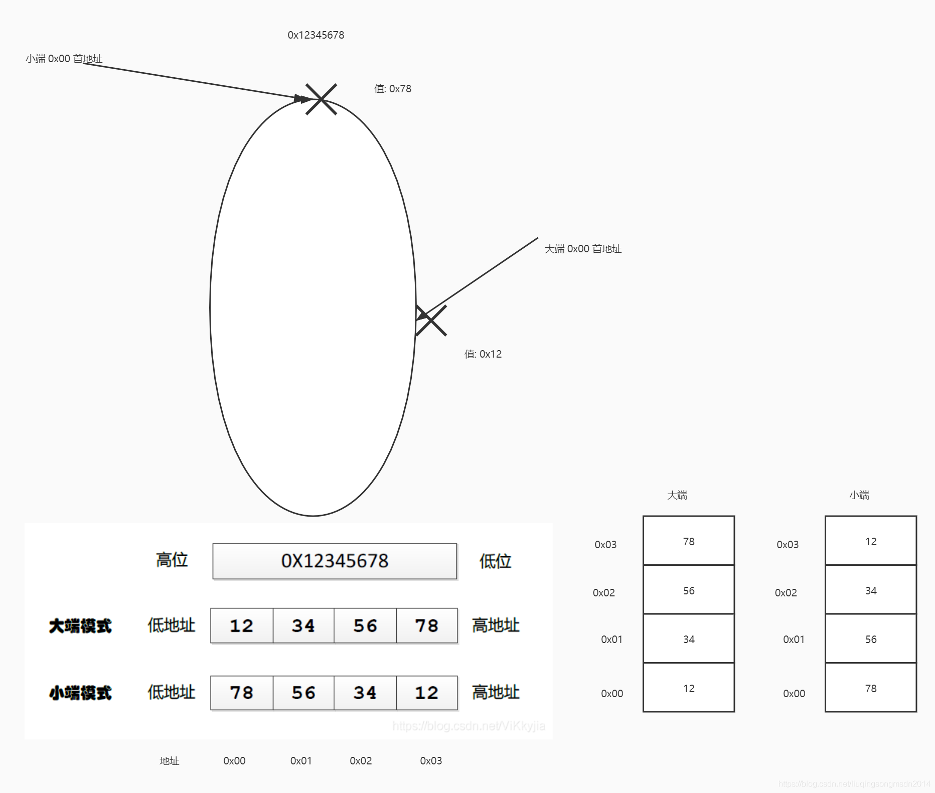 例:整数0x12345678用int类型的数来存储,其中每两个数字需要一个地址来存放,数据的尾部78,对于大端,即高尾部而言,78应该放在高字节地址;而对于小端,即低尾部而言,78应该放在低地址。