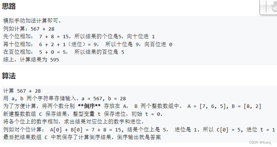 if(A.size()<B.size())return add(B,A);//A中存储较长的数方便计算