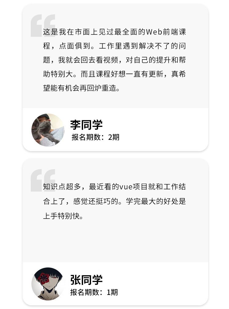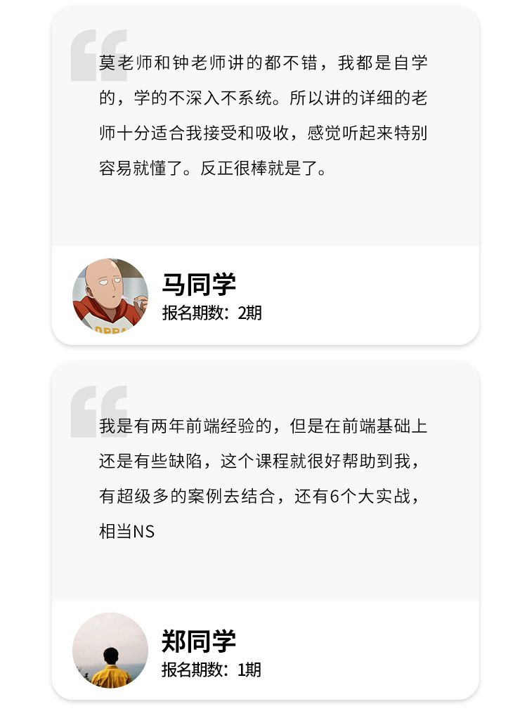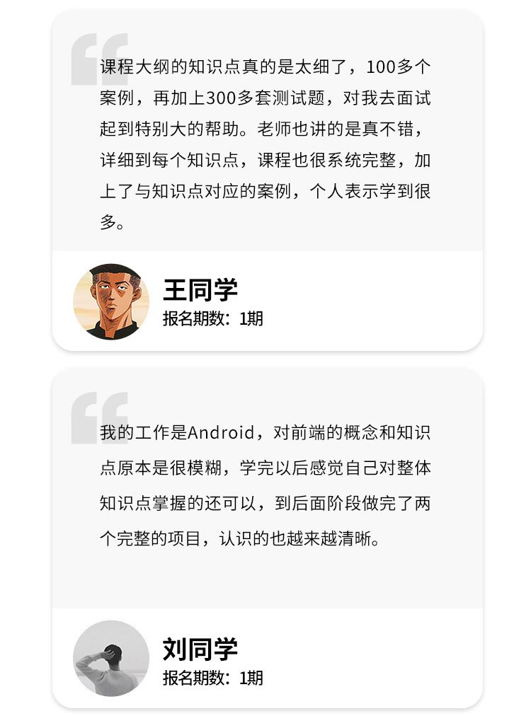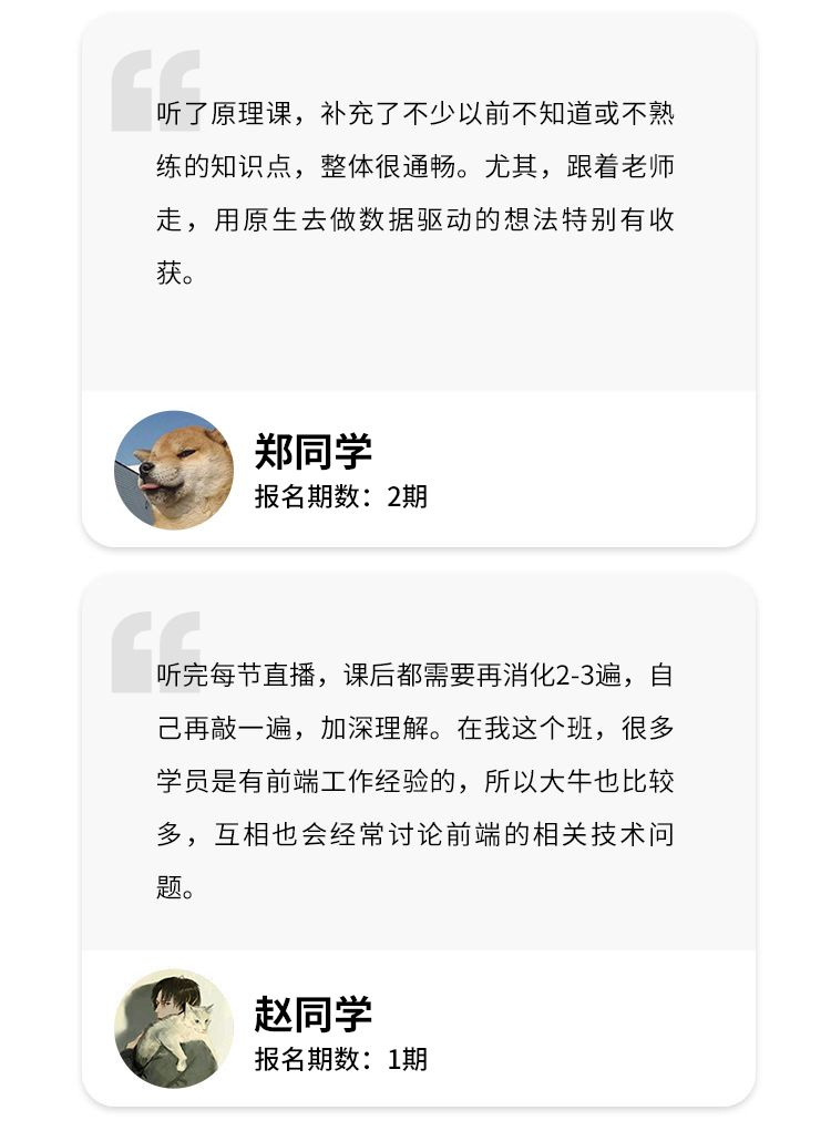 有大厂工作经验的老师们,除了能带你快速学会框架和逻辑,还能教会大家处理问题的思维方式,影响深远。另外,课程结束后也可以继续向老师请教咨询。