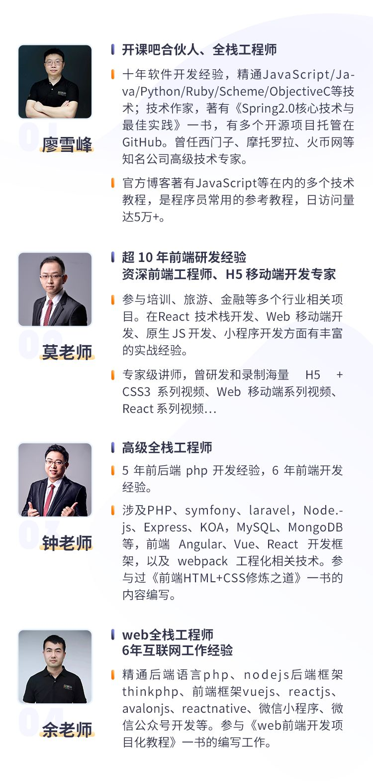 为了让更多前端人能系统又快速地成长,廖老师联合了开课吧专门为工作0~1.5年的刚入门前端初级工程师,以及有编程基础并对前端有兴趣的初学者打造出——《Web 前端高级工程师》。