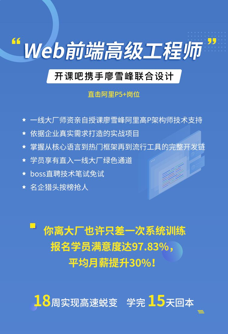 对于工作1.5-3年的中高级前端工程师的晋升,有对标阿里P6+的《web 全栈架构师》课,详情可咨询小助理或通过开课吧官网(www.kaikeba.com)查看。