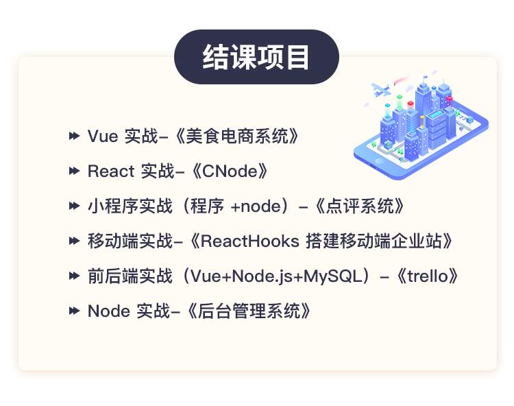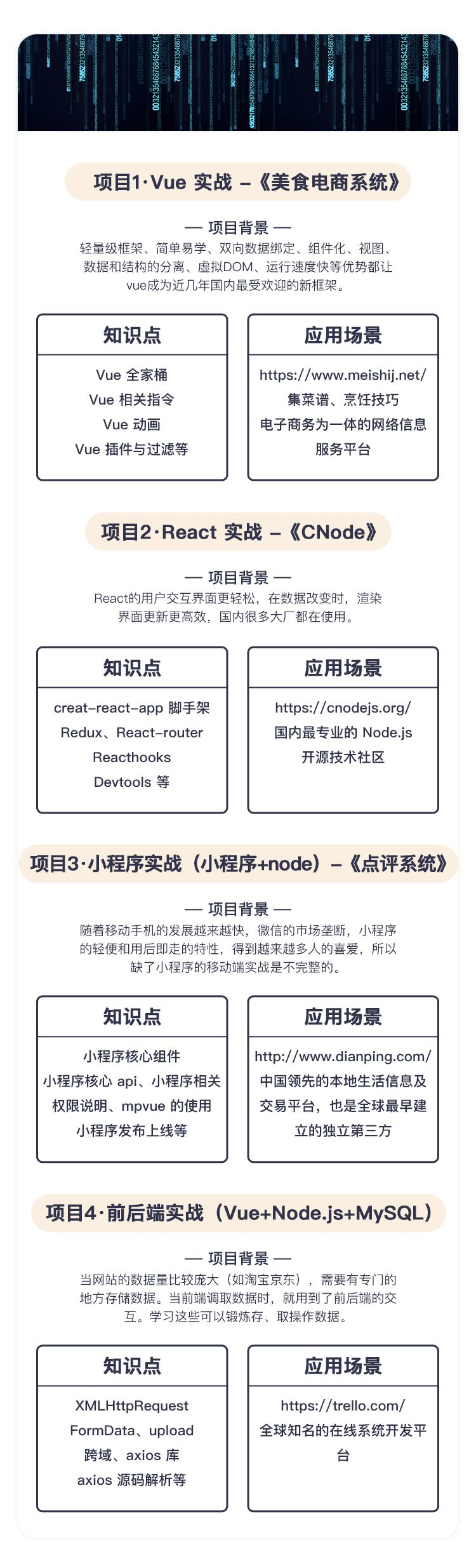 课程体系包括现有高流行度的新技术和框架如 react、 vue 、typescript 等。