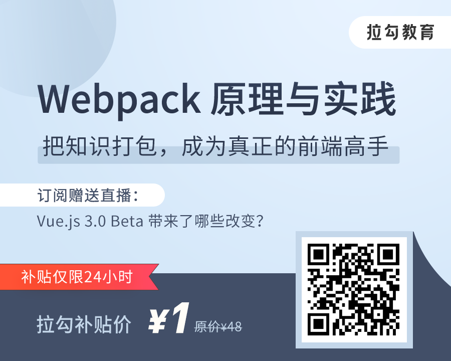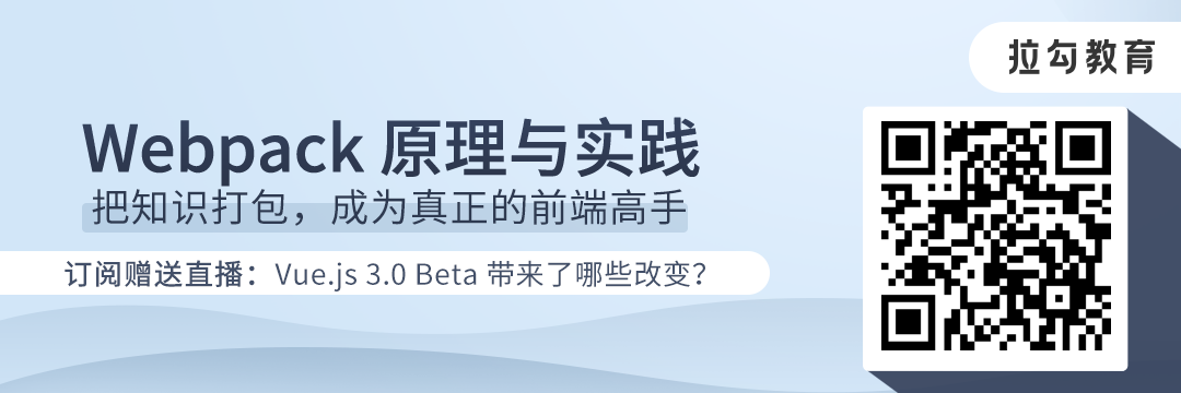 如果你也这样,为你推荐由拉勾教育出品的「Webpack 原理与实践」专栏。将带你更深度、更全面地认识 Webpack,建立对 Webpack 整体的知识体系,掌握自定义和扩展 Webpack 的方法和技巧,更高效地使用 Webpack 解决实际项目开发中的需求和问题。把现有的知识打包,让你成为真正的前端高手。
