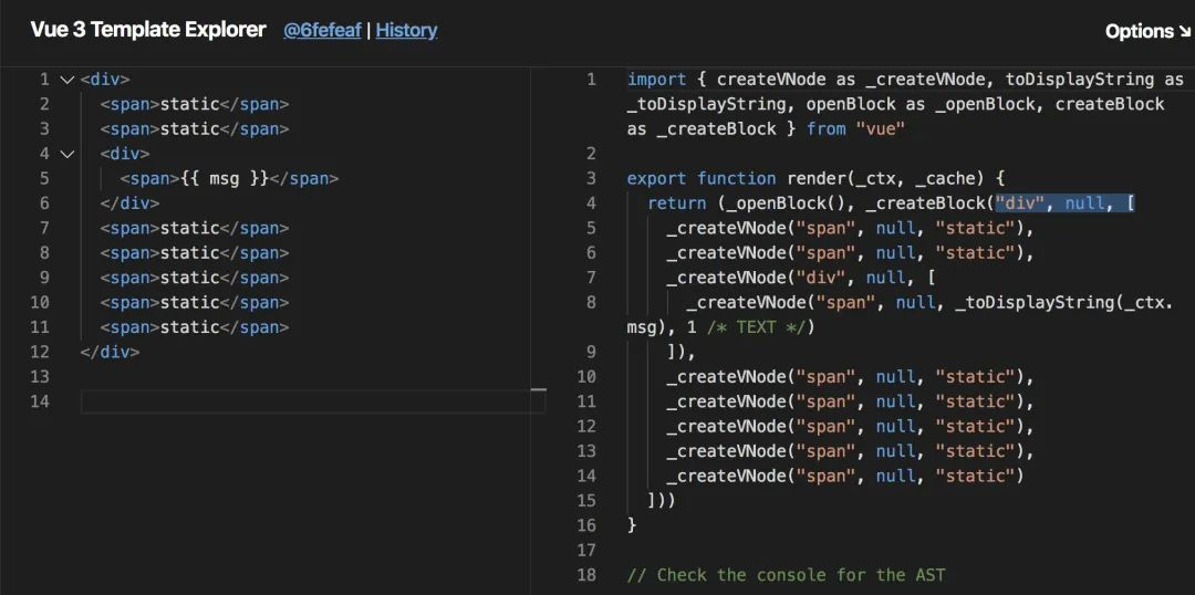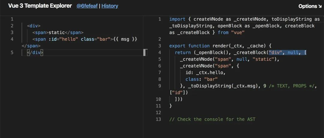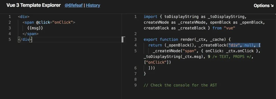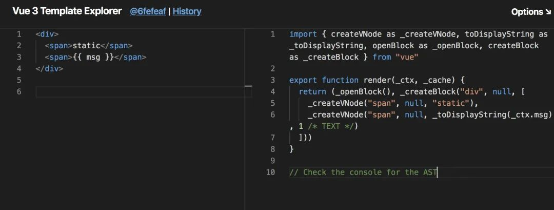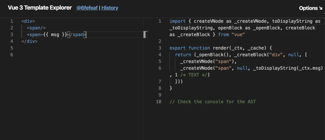 附:直播中用到的渲染模板查看工具地址:https://vue-next-template-explorer.netlify.app/