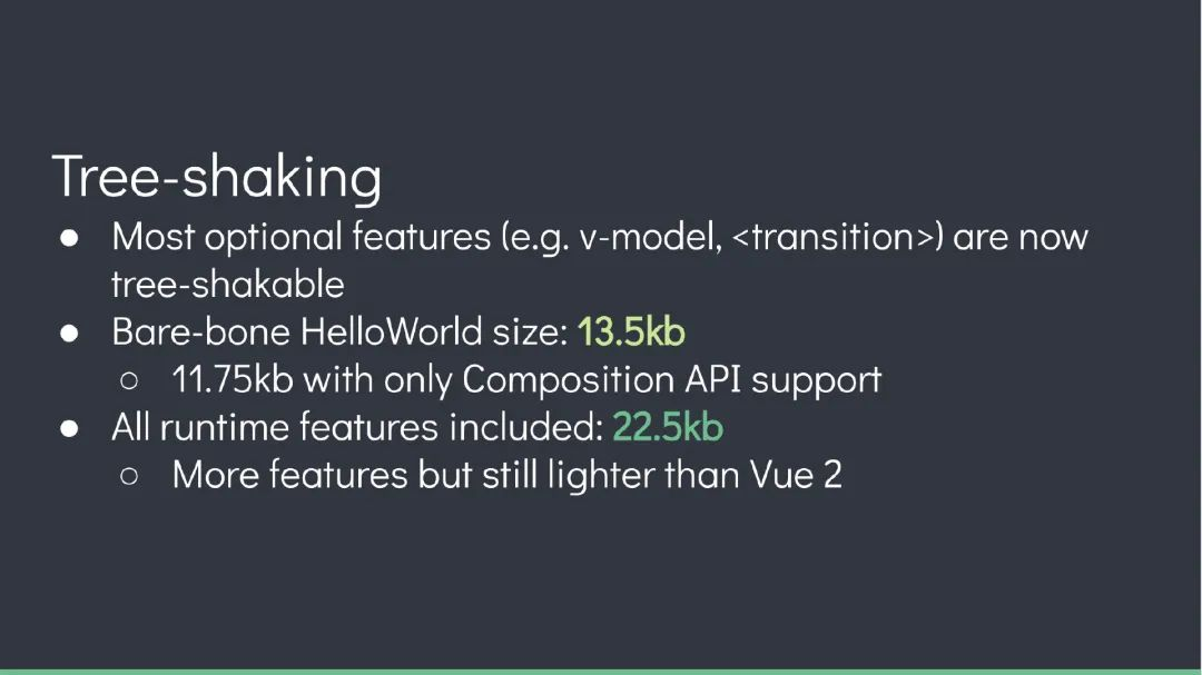 很多时候,我们并不需要 vue提供的所有功能,在 vue 2 并没有方式排除掉,但是 3.0 都可能做成了按需引入。