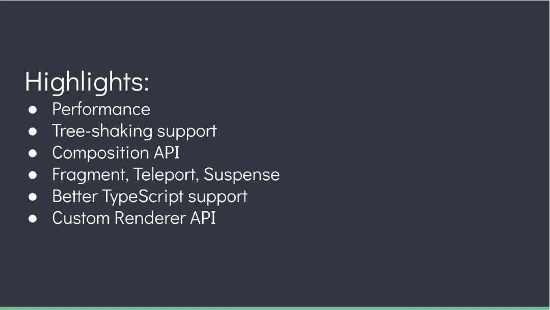 Performance:性能更比Vue 2.0强。Tree shaking support:可以将无用模块“剪辑”,仅打包需要的。Composition API:组合APIFragment, Teleport, Suspense:“碎片”,Teleport即Protal传送门,“悬念”Better TypeScript support:更优秀的 Ts 支持Custom Renderer API:暴露了自定义渲染API
