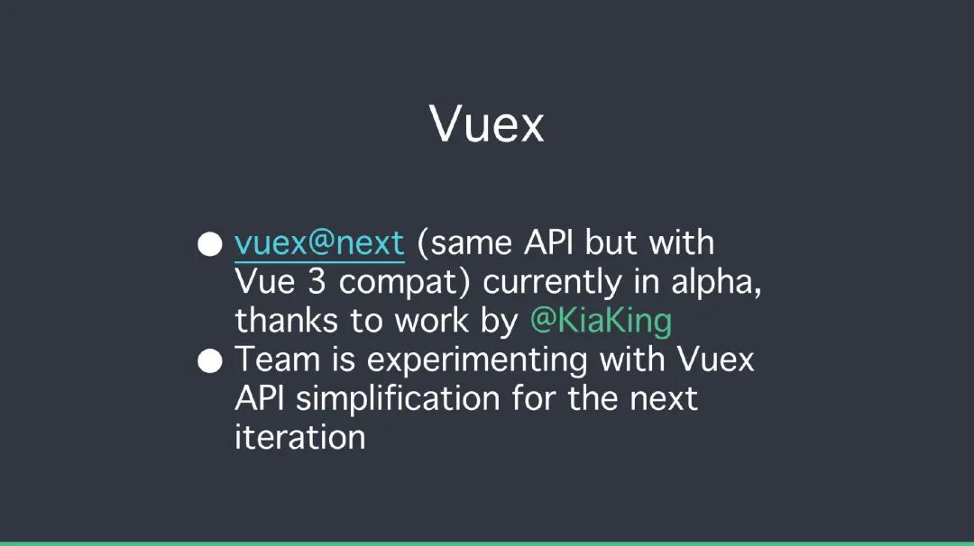 Vuex:,vuex@next(与Vue 3 compat相同的 API),已在alpha阶段,感谢@KiaKing。团队正在为下一次迭代试验
