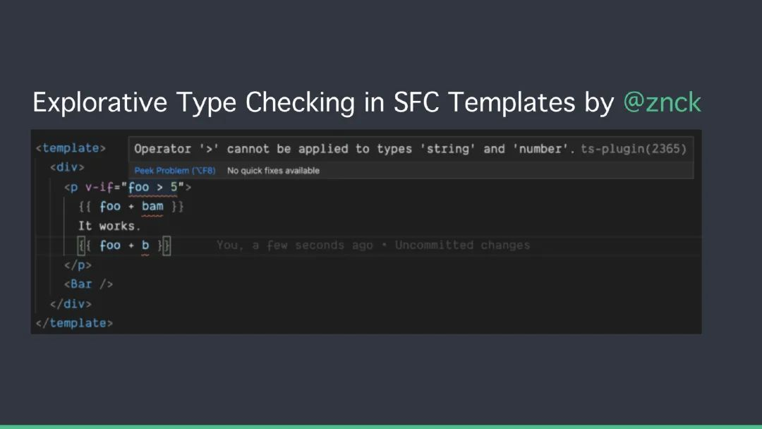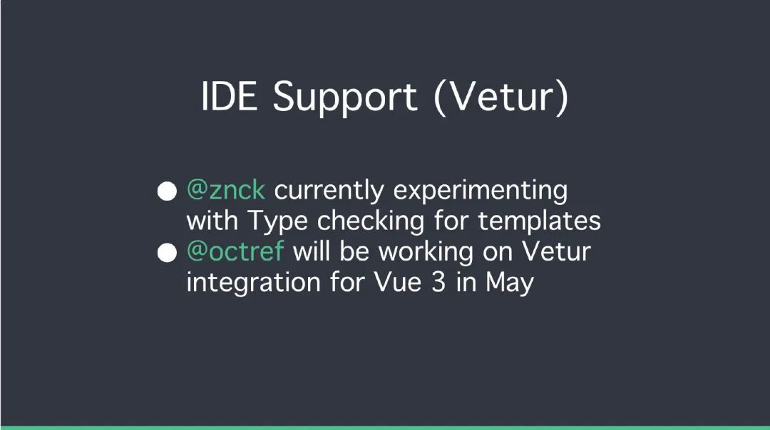 @znck目前正在试验模板的类型检查@octref将在 5 月为Vue 3进行Vetur集成