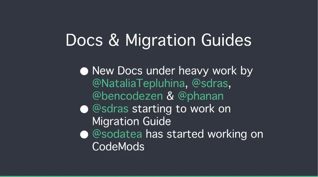 @NataliaTepluhina, @sdras, @bencodezen & @phanan负责@sdras正在做自动升级迁移工具@sodatea已经开始研究CodeMods