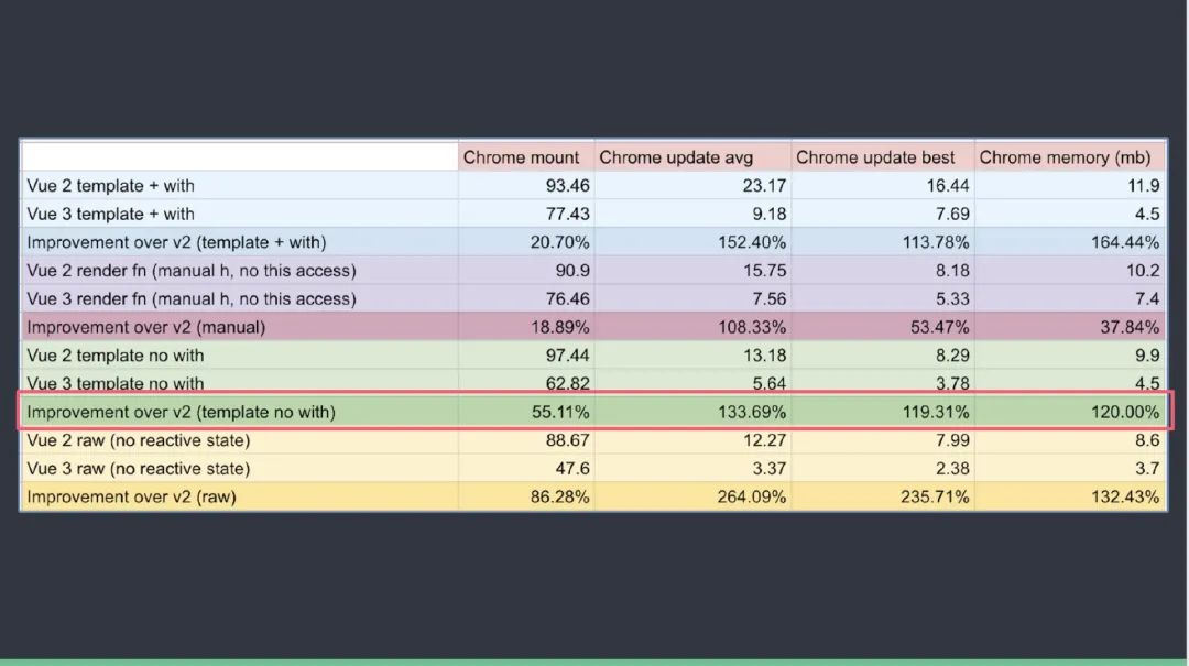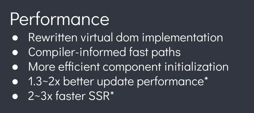 update性能提高 1.3~2 倍。SSR速度提高了 2~3 倍。