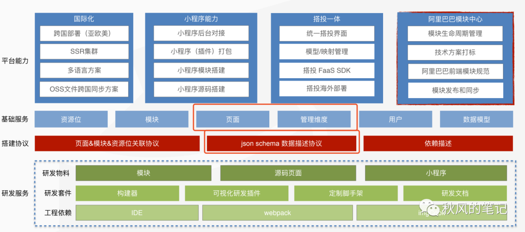 | 淘宝-天马[9](未开源) | 跨端页面搭建![]() ![]() | 跨终端搭建页面;面向标准数据研发schema.json;对模块的props入参描述;数据标准化;数据驱动展示;编写模块代码(解耦、模块即代码);打包每个模块单独打包;从页面视角seed动态加载;跨终端的缓存方案(phone tm tb缓存副本、对应访问、代码标识);服务端渲染SSR | ![]() ![]() ![]() ![]() |