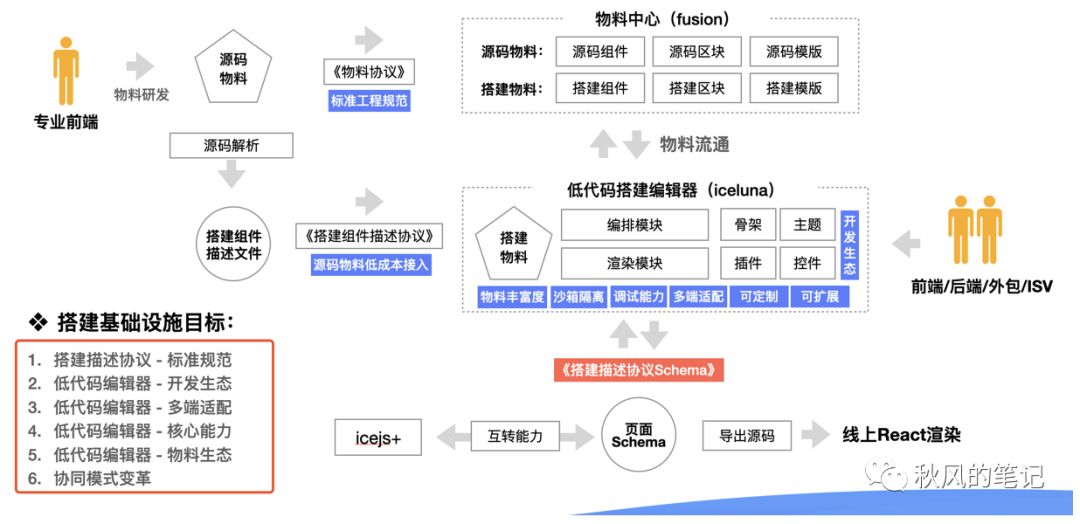 | 阿里-iceluna、Paas [4] | 配置生成搭建描述协议 - 标准规范 - Schema再生成页面及逻辑、低代码编辑器 - 开发生态 | 改变生产关系,提升生产力(赋能)- 中后台通用搭建产品--所有人;降低研发成本(提效)- 低代码开发平台--开发人员(工程创建、开发、调试、发布全链路);孵化领域产品(搭建生态)- PaaS平台--开发人员(基础设施,基于标准搭建协议生产搭建物料,为各业务场景提供搭建服务的运行和开发环境) | ![]() |