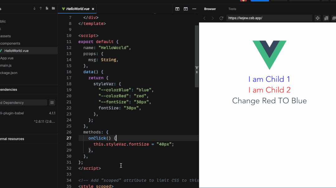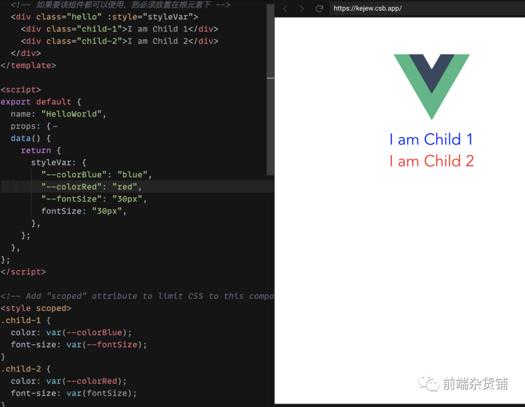 我们只需要在组件的根元素中设置 :style="styleVar"(如果要该组件都可以使用,则必须放置在根元素下),就可以在 Vue 2.x 中实现组件中的状态和 CSS 值的绑定,而且这种绑定关系是响应式的,比如我定义一个方法,改变 font-size 的值,是可以实时更新的