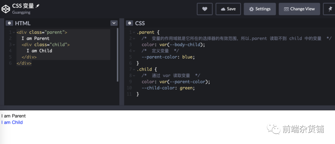 [2]CSS 变量基础演示地址: https://codepen.io/gpingfeng/pen/BaLPxoy?editors=1100