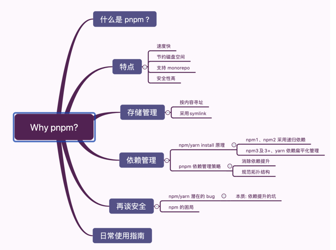 这篇文章给大家分享一个业内一款出色的包管理器——pnpm。目前 GitHub 已经有 star 9.8k,现在已经相对成熟且稳定了。它由 npm/yarn 衍生而来,但却解决了 npm/yarn 内部潜在的 bug,并且极大了地优化了性能,扩展了使用场景。下面是本文的思维导图: