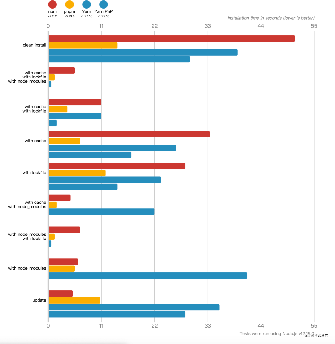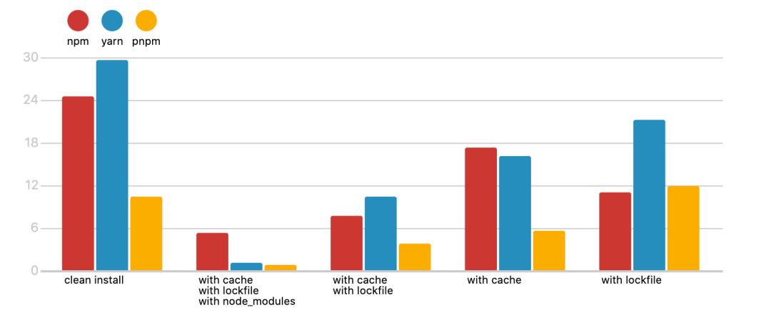 可以看到,作为黄色部分的 pnpm,在绝多大数场景下,包安装的速度都是明显优于 npm/yarn,速度会比 npm/yarn 快 2-3 倍。