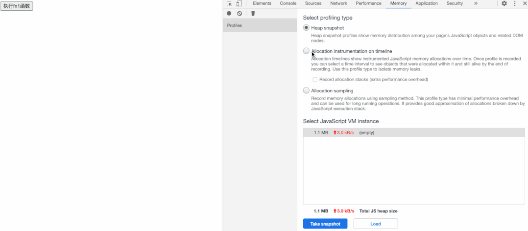 按道理来说点击按钮执行fn1函数后会退出该函数的执行上下文,紧跟着函数体内的局部变量应该被清除,但图中performance的录制结果显示似乎是存在内存泄漏问题的,即最终曲线高度比基准线高度要高,那么再用Memory来确认一次: