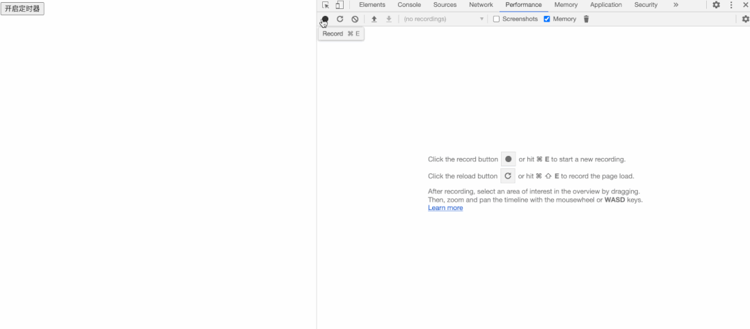 然后打开开发者工具,找到Performance这一栏,可以看到其内部带着一些功能按钮,例如:开始录制按钮;刷新页面按钮;清空记录按钮;记录并可视化js内存、节点、事件监听器按钮;触发垃圾回收机制按钮等等