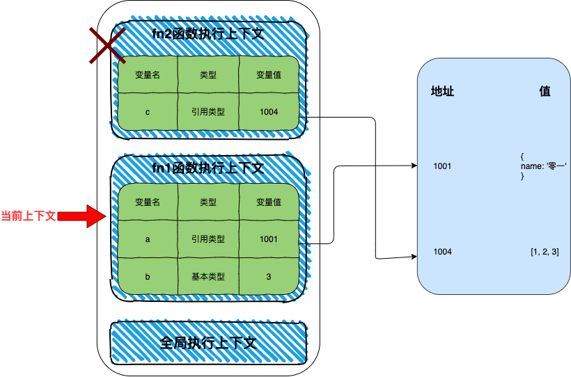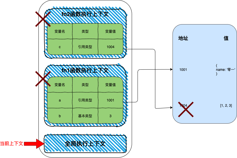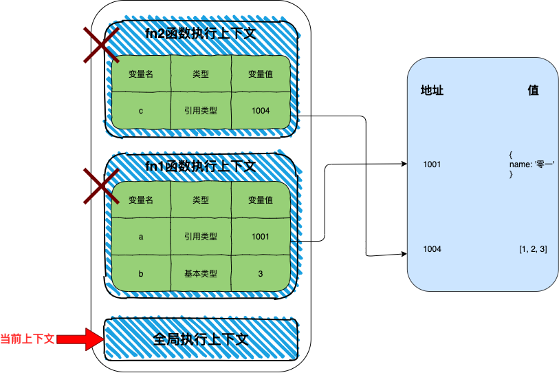 待fn2函数内部执行完毕以后,就该退出fn2函数执行上下文了,即箭头向下移动,此时fn2函数执行上下文会被清除并释放栈内存空间,如图所示: