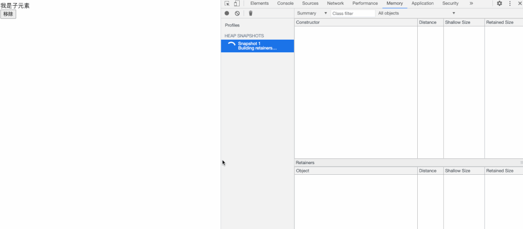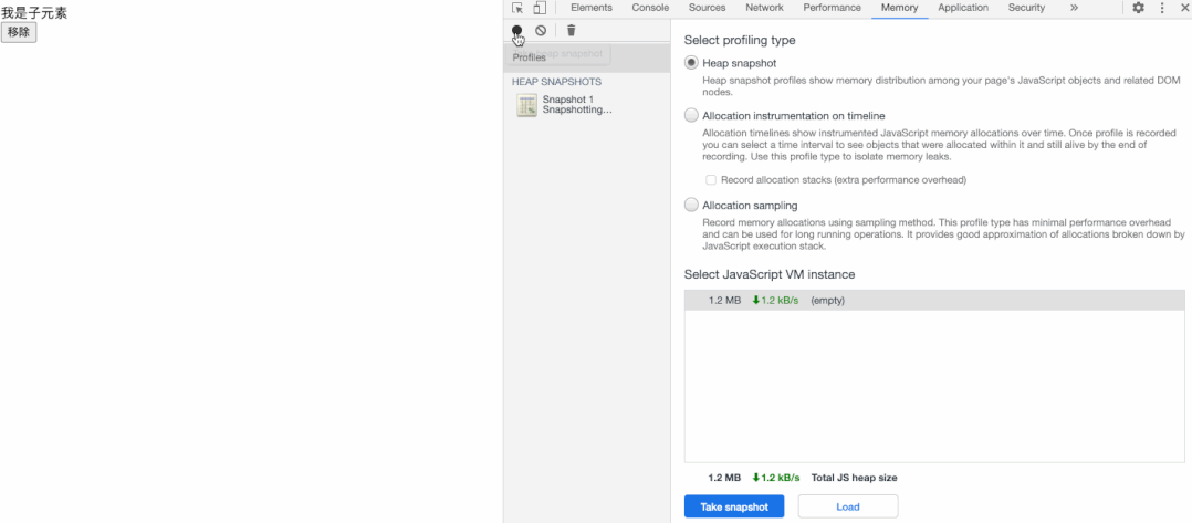 改动很简单,就是将对.child节点的引用移动到了click事件的回调函数中,那么当移除节点并退出回调函数的执行上文后就会自动清除对该节点的引用,那么自然就不会存在内存泄漏的情况了,我们来验证一下,如下图所示: