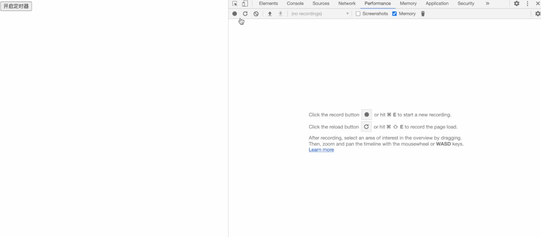 接下来尝试使用Performance和Memory来查看一下闭包导致的内存泄漏问题,为了使内存泄漏的结果更加明显,我们稍微改动一下文章开头的例子,代码如下: