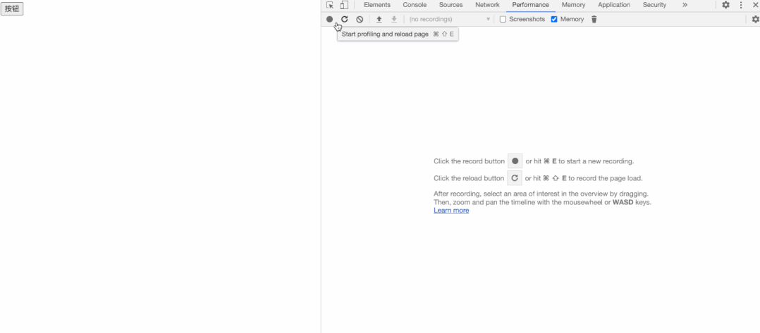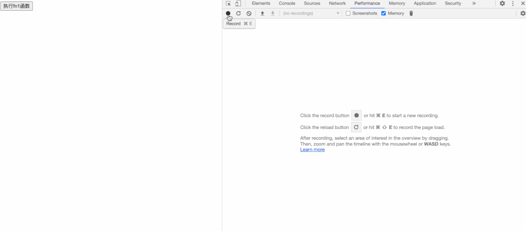 设置了一个按钮,每次执行就会将fn1函数的返回值添加到全局数组变量res中,是为了能在performacne的曲线图中看出效果,如图所示: