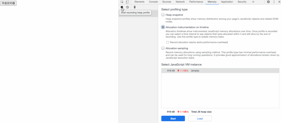 再来看看开发者工具中的Memory一栏,其主要是用于记录页面堆内存的具体情况以及js堆内存随加载时间线动态的分配情况