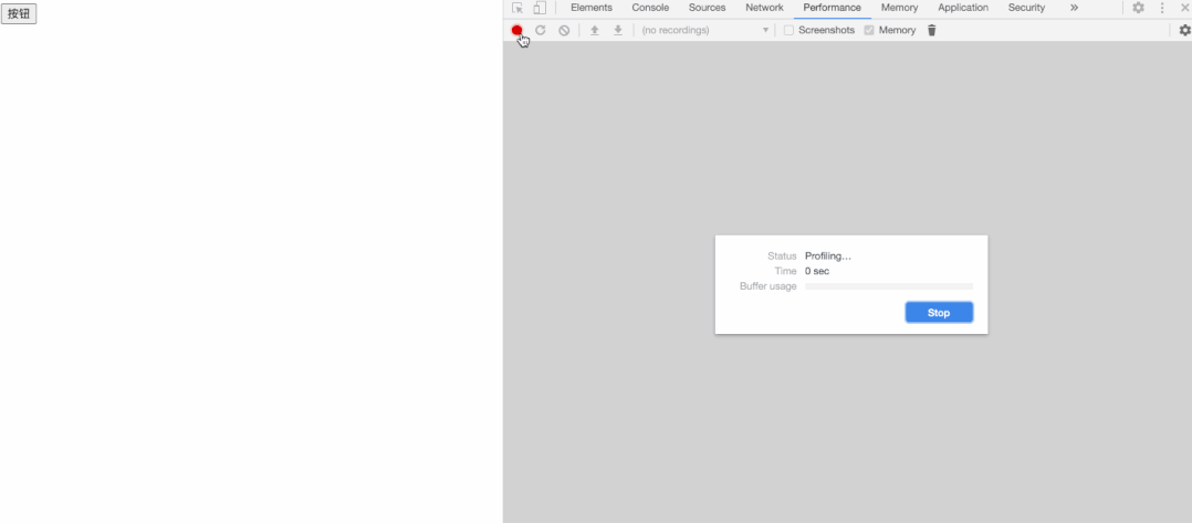 我们在按钮的点击回调事件中创建了一个很大的数组对象并打印,用performance来验证一下:
