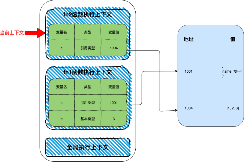 当代码执行到fn2()时,栈空间内的执行上下文从上往下依次是 fn2函数执行上下文 => fn1函数执行上下文 => 全局执行上下文