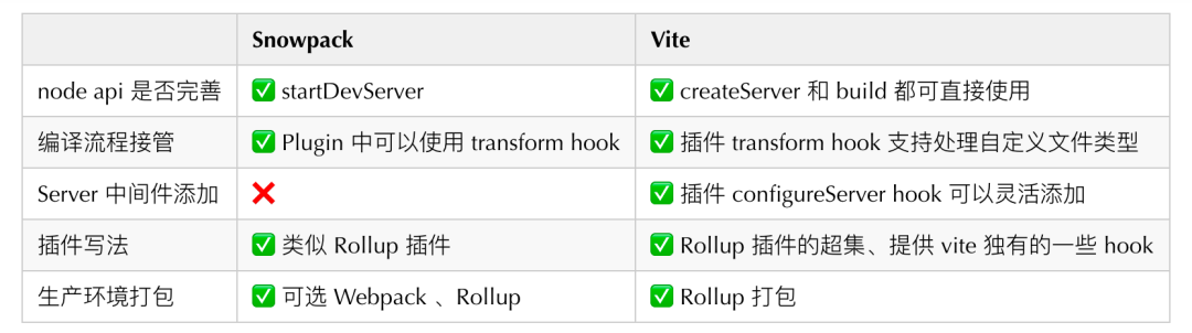 由于我们的应用开发工具提供了一套现代 Web 项目开发范式,从应用入口和各种资源的处理使用,以及服务端 API 的一体化调用上都有内部一些标准。直接在项目中使用上述工具会有很多问题,免不了对上面的工具进行二次开发,这就要求这些工具提供足够灵活的扩展自定义方式,这里就业界用的比较多的 Snowpack 和 Vite 2.0 简单对比如下: