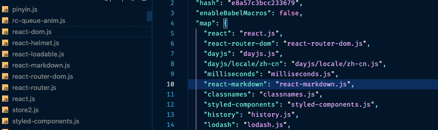可以看到依赖项 object-assign 会额外带有版本号信息。在递归下载第三方依赖 ESM 文件后,能够得到如下的 json 文件,存储某个版本依赖实际 ESM 文件的路径, 如下: