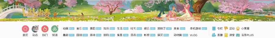 结合产品及业务的创意动画,是需要挖掘,不断打磨的不断迭代的。譬如大家津津乐道的 BiliBili 官网,它的顶部 Banner,配合一些节日、活动,经常就会有出现一些有意思的创意交互动画。简单看两个: