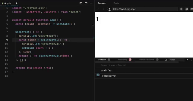 可以看到依赖项数组是正确的,并且解决了上面的问题,但是也可以发现,随之带来的问题是:定时器会在每一次 count 改变后清除和重新设定,重复创建/销毁,这不是我们想要的结果。