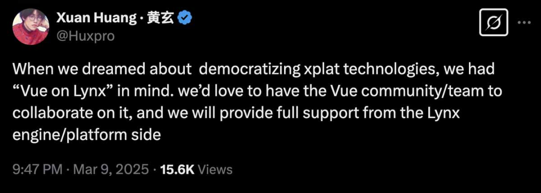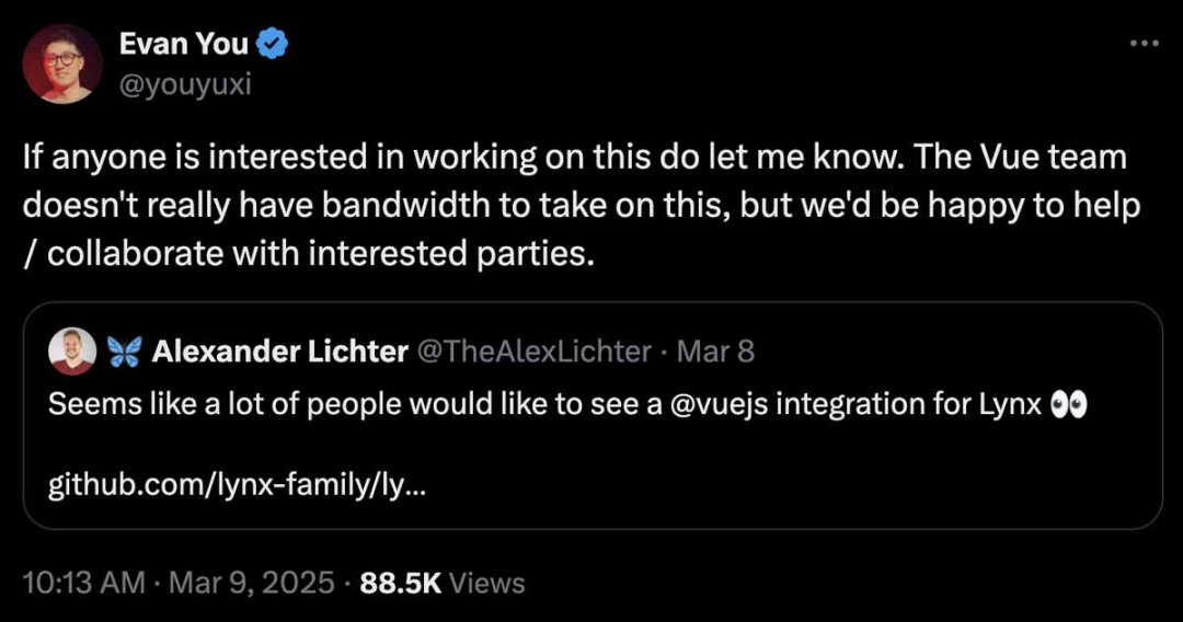 Lynx 首发支持的是 React(ReactLynx)。随后,社区关于“Vue 版本”的讨论迅速升温。最受关注的一次,来自 Vue.js 创始人 Evan You 在 X 上的发声:如果有人愿意推进 Vue on Lynx,Vue 团队非常乐意支持。
