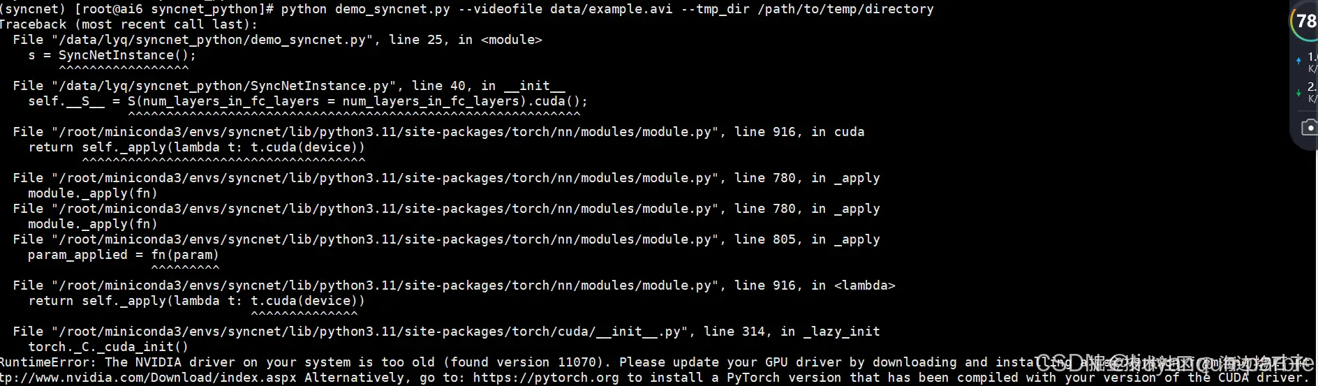 系统的NVIDIA驱动版本太旧,无法与当前PyTorch使用的CUDA版本兼容