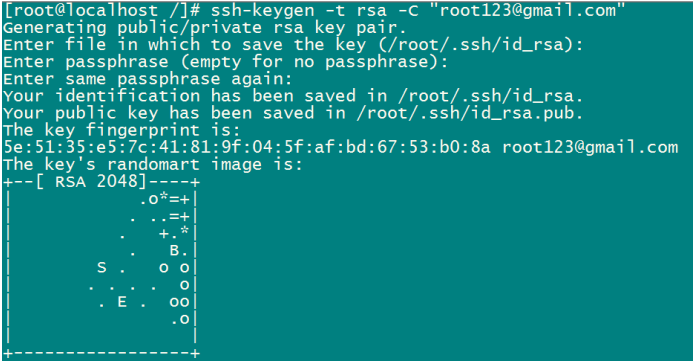 # ssh-keygen -t rsa -C "root123@gmail.com" (root123@gmail.com是自定义部分,保持