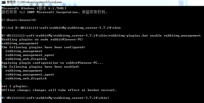 用cmd进入到D:\011111111\soft\rabbitMq\rabbitmq_server-3.7.14\sbin 目录(即你安装rabbitmq目录下的sbin文件夹)