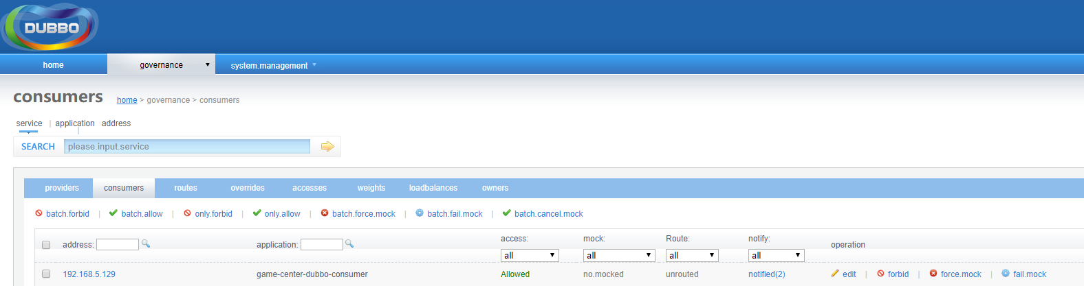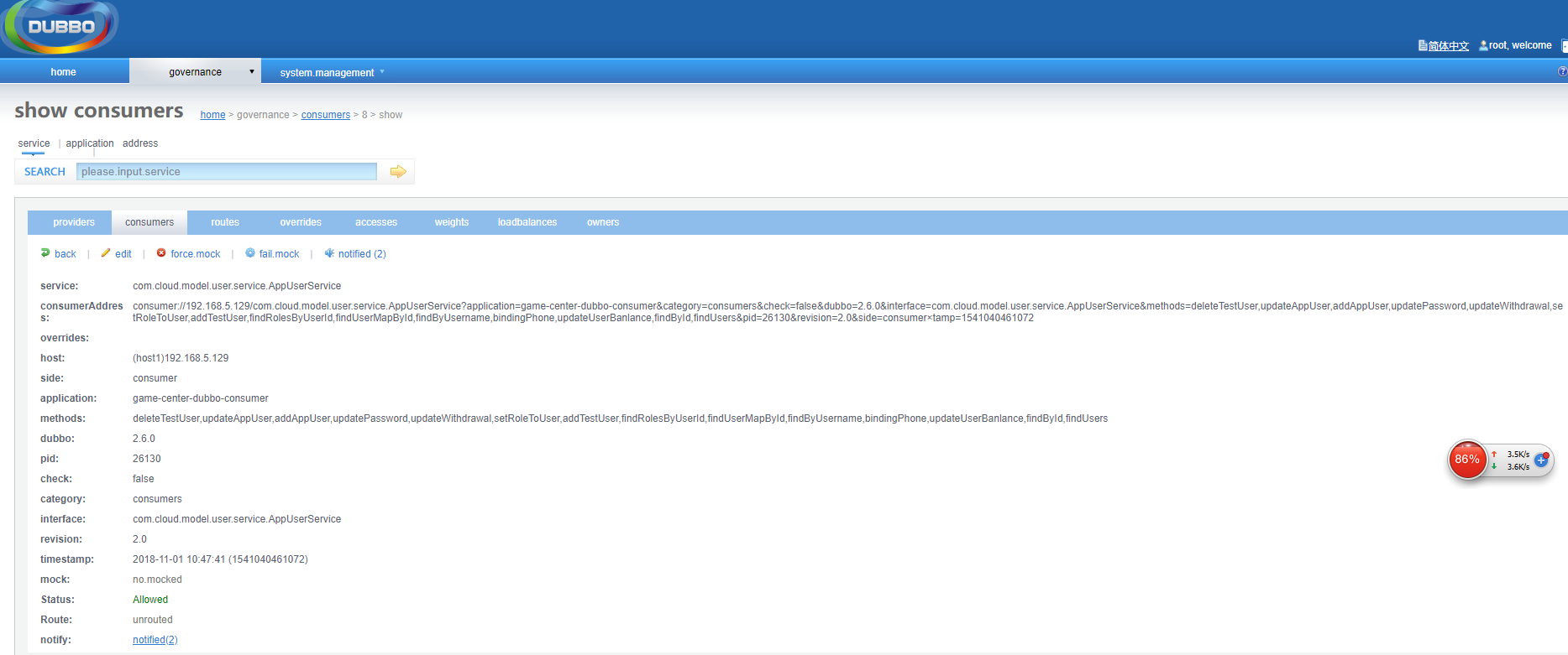 启动游戏中心项目,在Dubbo控制台中的消费者中,我们可以看到