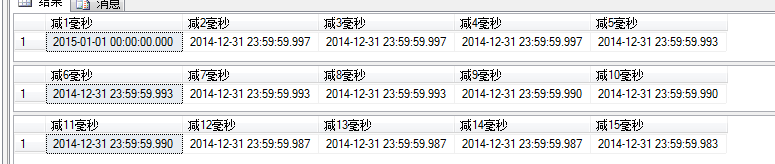 DATEADD(ms,-3, '2015-01-01 00:00:00.000') as '减3毫秒',