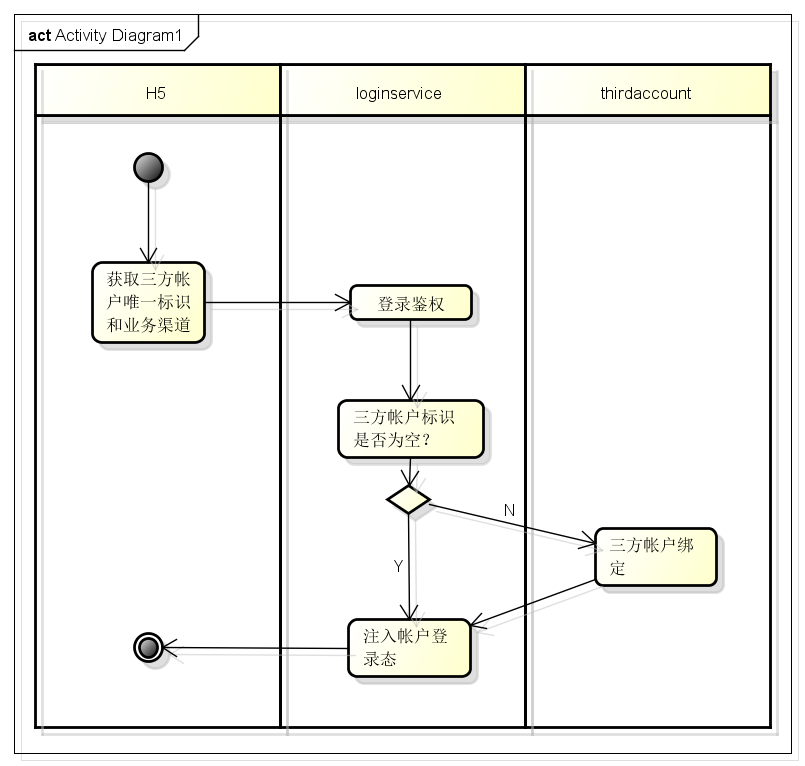 前端同事遇到了疼点:两个相似度极大的模块静态资源存在两份,每次加入新的登录鉴权方式,都需要两边维护,成本较高,因此,前端便希望抽象出统一的页面和前端业务逻辑,配套的前端希望服务端统一提供一个登录接口,这个接口既可以做纯粹的登录,也可以做‘三方帐户绑定’,只需要多送两个:三方业务渠道(channel)、三方帐户标识(thirdAccountNo),服务端的接口判定thirdAccountNo是否有值来决定,在登录鉴权完成后,是否需要做三方帐户绑定。流程简述如下: